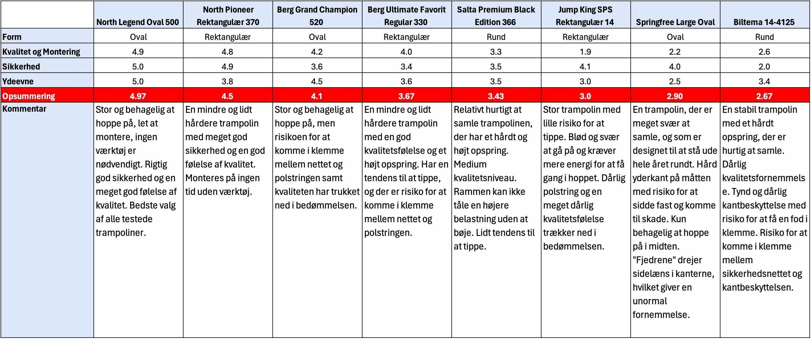Testen viser, at en veldesignet trampolin er meget sikker. Det er her, de største forskelle mellem trampolinerne i testen er mest mærkbare.