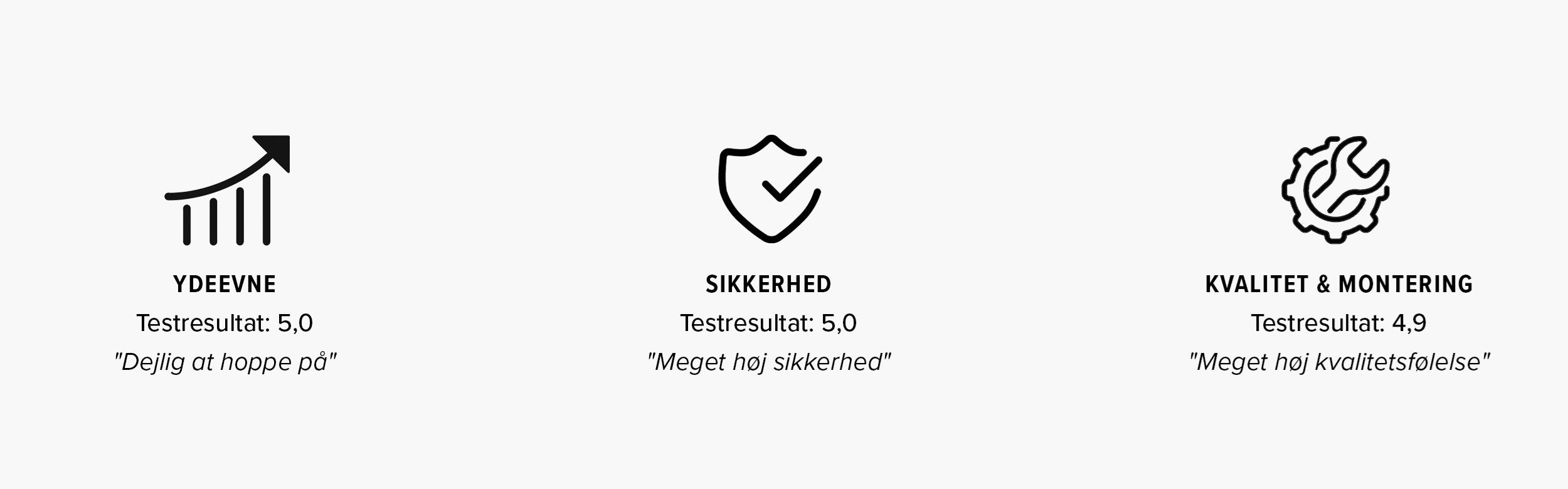 Vi har bedt RISE om at vurdere vores trampolin North Legend i forhold til 7 andre modeller. RISE er et uafhængigt statsligt forskningsinstitut med unik kompetence til at teste og evaluere ydeevne, sikkerhed og kvalitet. Testen bestod af mere end 17 forskellige tests, der pressede trampolinerne til det yderste.