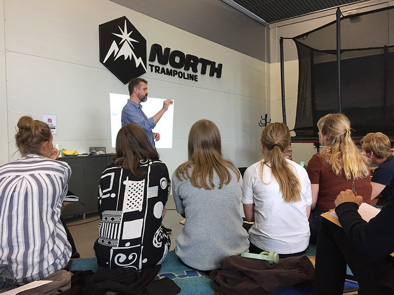 Thomas Hagel, R&D Manager hos North Trampoline, taler om produktionsmetoder og materialer med de studerende på Industrial Design Programme, Gävle Universitet.