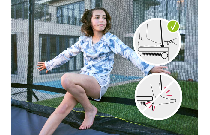 Hvis der er et mellemrum, så skal børnene nok finde det, så vi har gjort det umuligt at komme i nærheden af fjedrene, når der hoppes eller bare slappes af på trampolinen. Kraftig kantbeskyttelsen forhindrer, at der landes direkte på fjedre eller ramme-dele. Vi har endda tilført ekstra sikkerhed ved at dække stængerne udenfor nettet med højkvalitets skum.